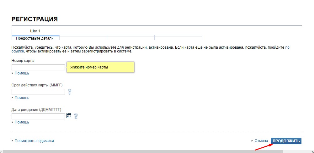 В диалоговом окне нужно вписать номер, срок действия карты, дату рождения, затем нажать «Продолжить».