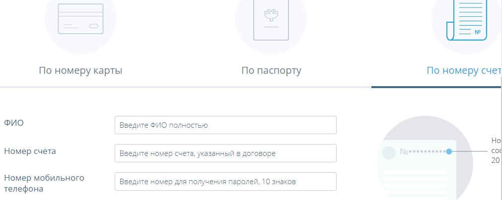- Третий, последний вариант – по номеру счета. Здесь нужно указать номер счета, ранее оформленный в банке его сотрудниками.