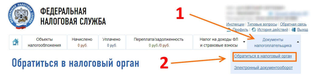 Войдя в него необходимо перейти в самый крайний раздел справа "Документы налогоплательщика" - "Обратиться в налоговый орган".