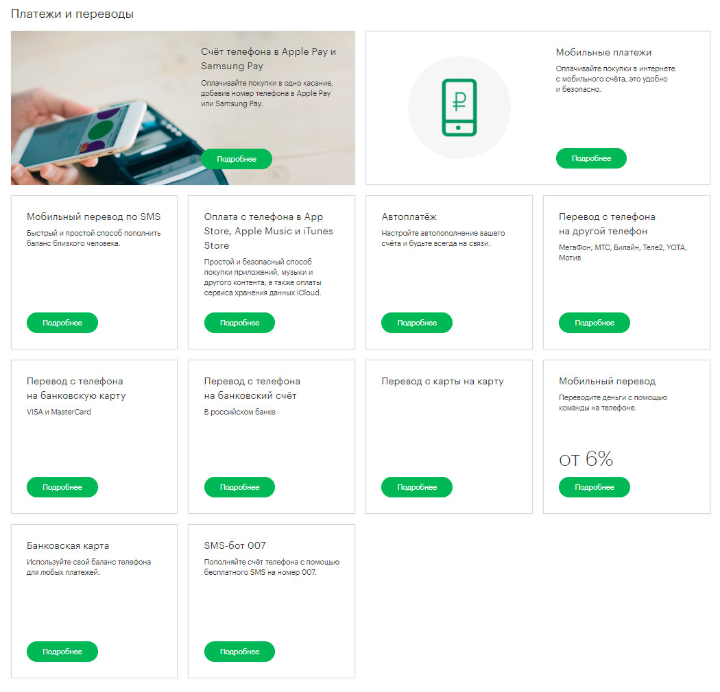 - Перевод денежных средств между номерами внутри сети и банковским счетом. Воспользуйтесь этой опцией для трансфера средств на карту Visa или MasterCard.
