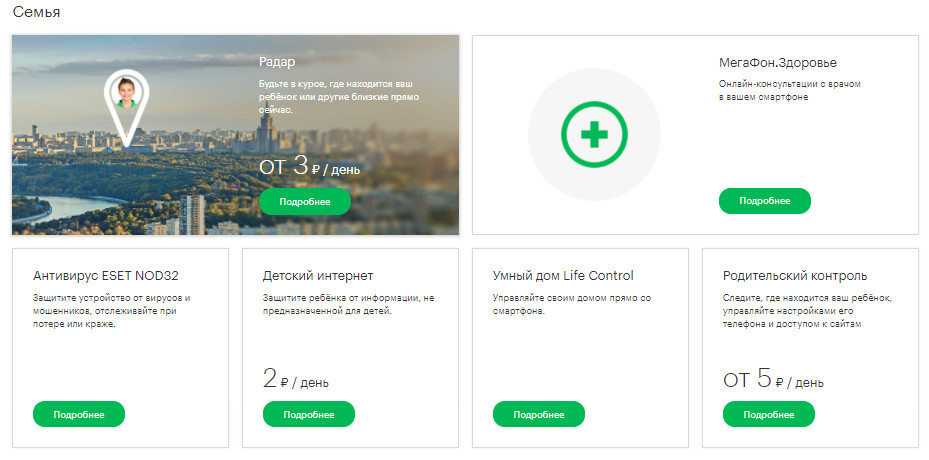 - В специальном разделе доступен «Мегафон-Бонус» — это программа лояльности при участии в которой баллы (бонусы) можно обменять на услуги оператора.