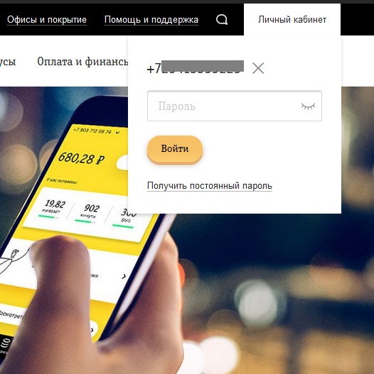 На основной странице beeline.ru в форме ввода данных вписываем номер мобильного (без +7) и указываем заранее присвоенный учетной записи пароль.