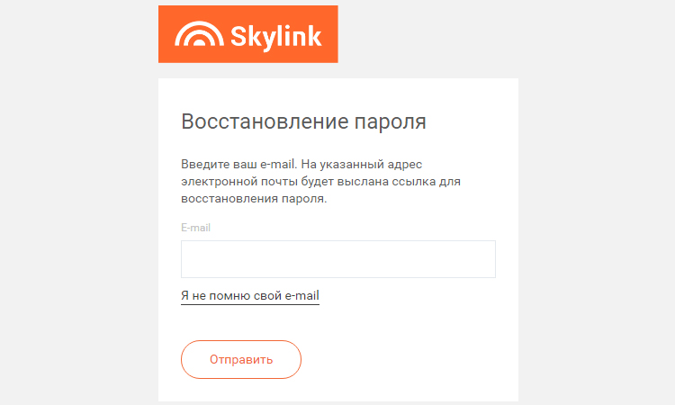 На странице входа также присутствует ссылка для восстановления пароля от ЛК Skylink. При нажатии на нее, система попросит вас ввести электронный адрес, указанный в договоре на обслуживание. На него будет выслана ссылка для восстановления пароля. Перейдя по ней из почтового ящика, вы сможете поменять свой пароль.