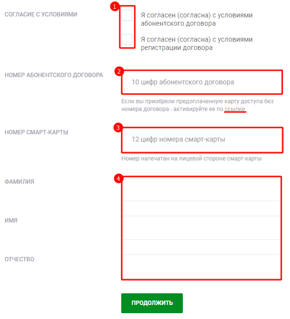 - Ввести 10-значный номер договора. Если была приобретена предоплаченная карта без договора, то перейти по ссылке.